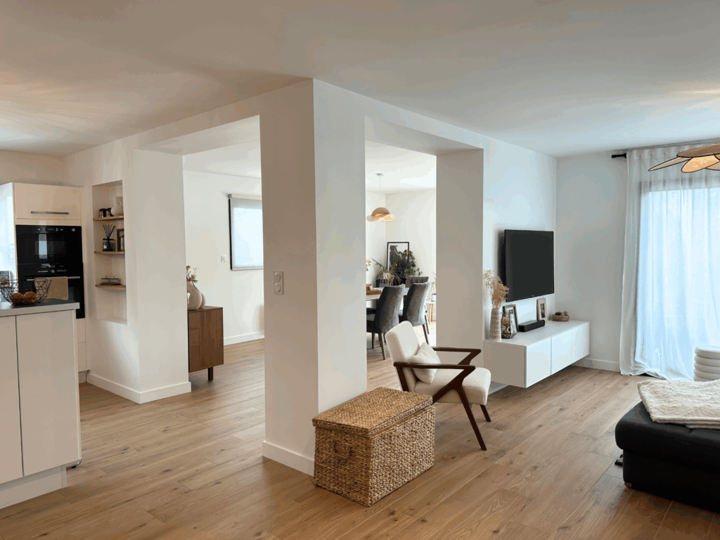 ✔️ Extension de la pièce à vivre : création d’une salle à manger conviviale et baignée de lumière, dans le prolongement naturel de la cuisine et du salon.