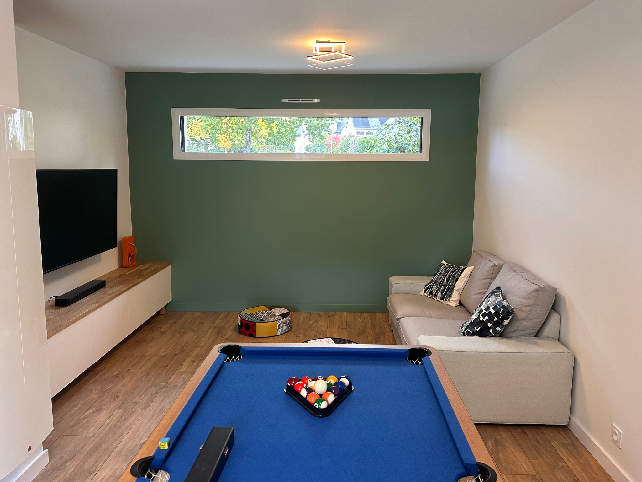 – Coin détente modulable : télé et billard, pouvant facilement se transformer en chambre