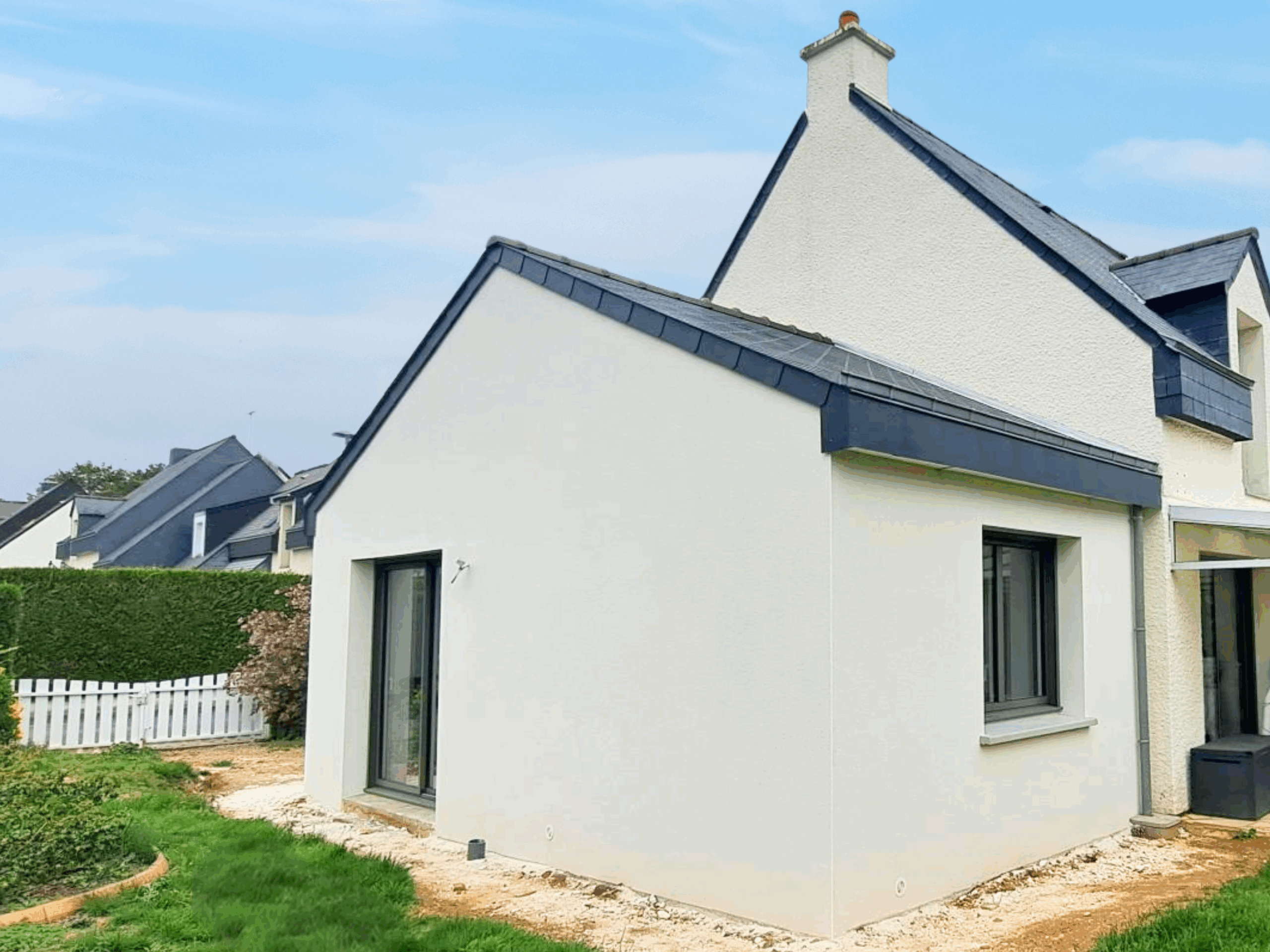 Harmoniser l’ensemble avec la maison existante : toiture à deux pans en ardoises, menuiseries grises modernes, enduit blanc lumineux et parquet au sol créent une continuité esthétique parfaite. La gouttière nantaise et la descente en zinc gris quartz apportent une finition soignée et élégante.