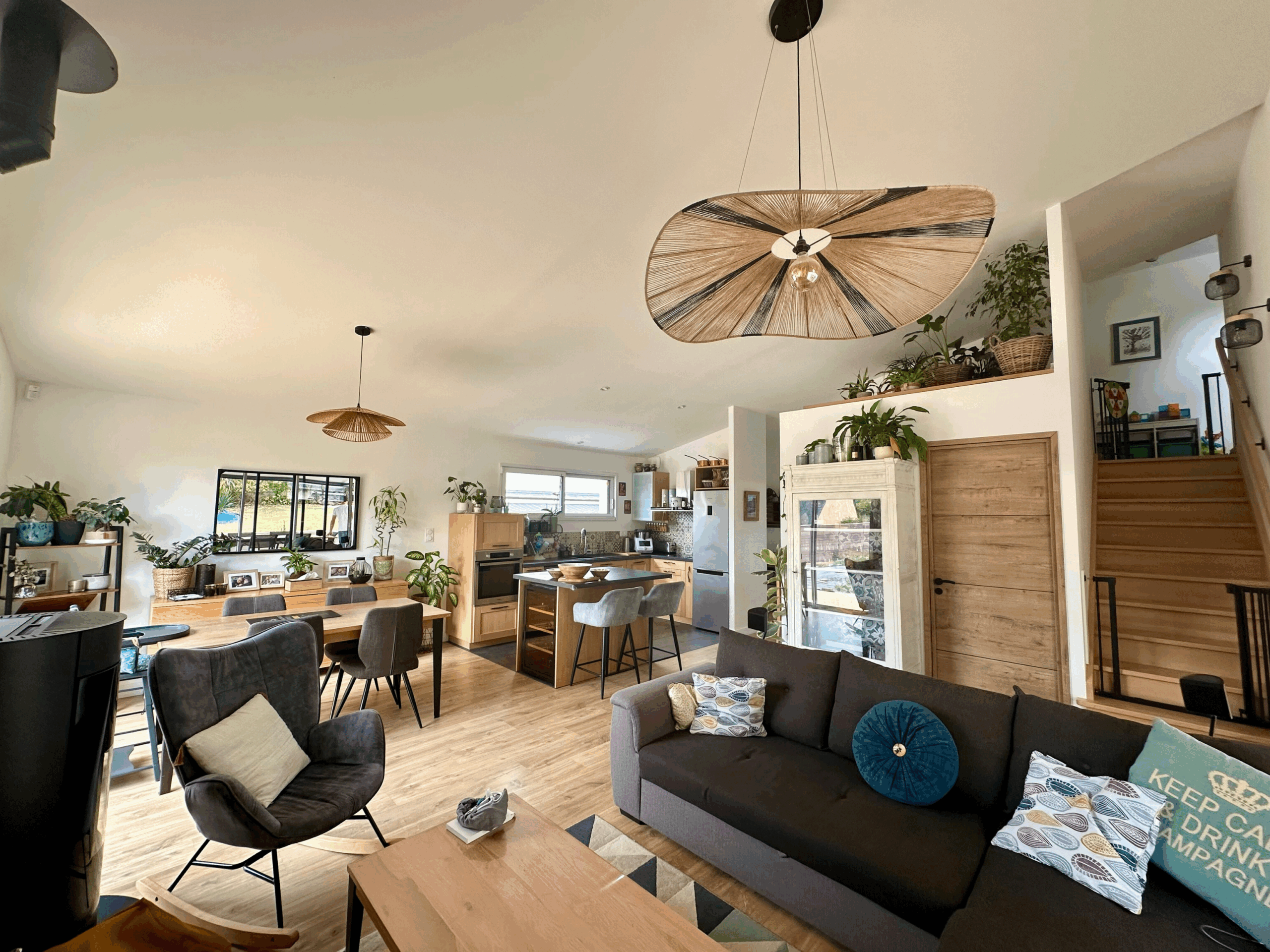 Le parquet, le poêle, l’escalier en bois et la décoration permettent de créer une ambiance chaleureuse.